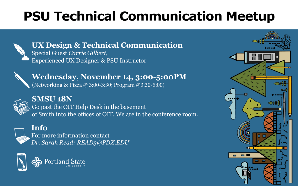 Flyer designed for the Technical Communication Meetup for Portland State University’s Master of Technical and Professional Communication Program along with my cohorts Diana Ruiz, Rowan Reed, and Stephen Helgeson.